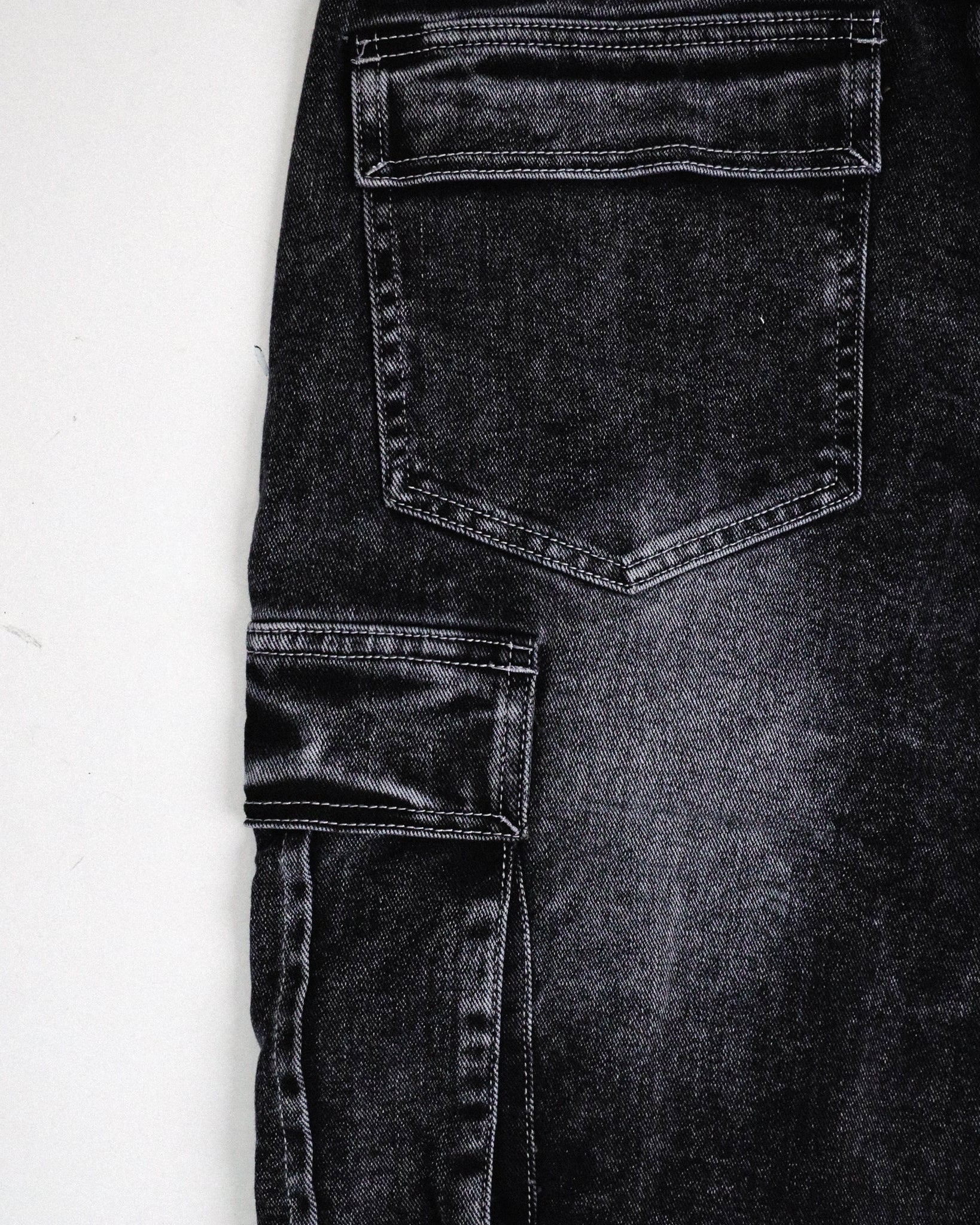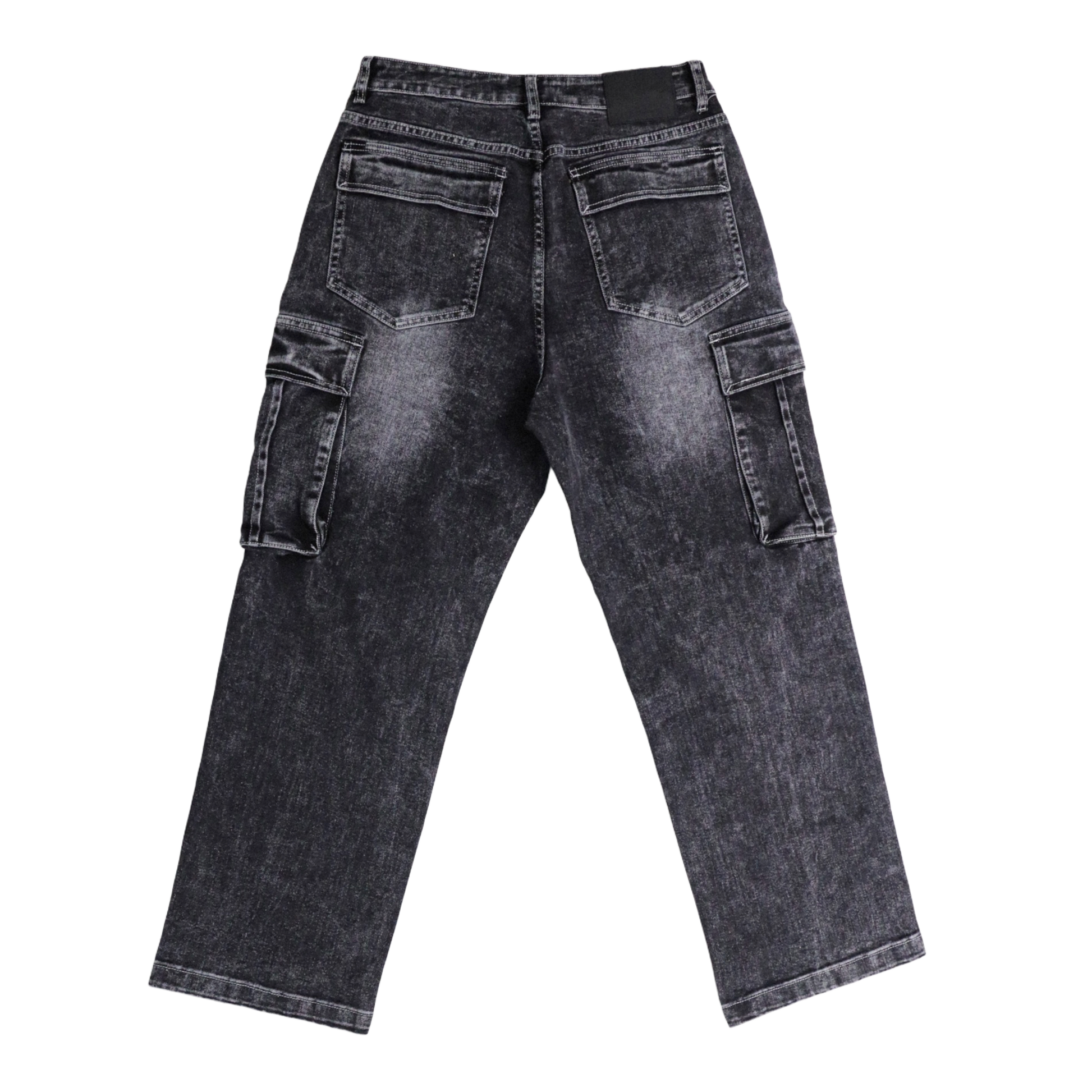 Pantalón de mezclilla tipo cargo gris con proceso deslavado.