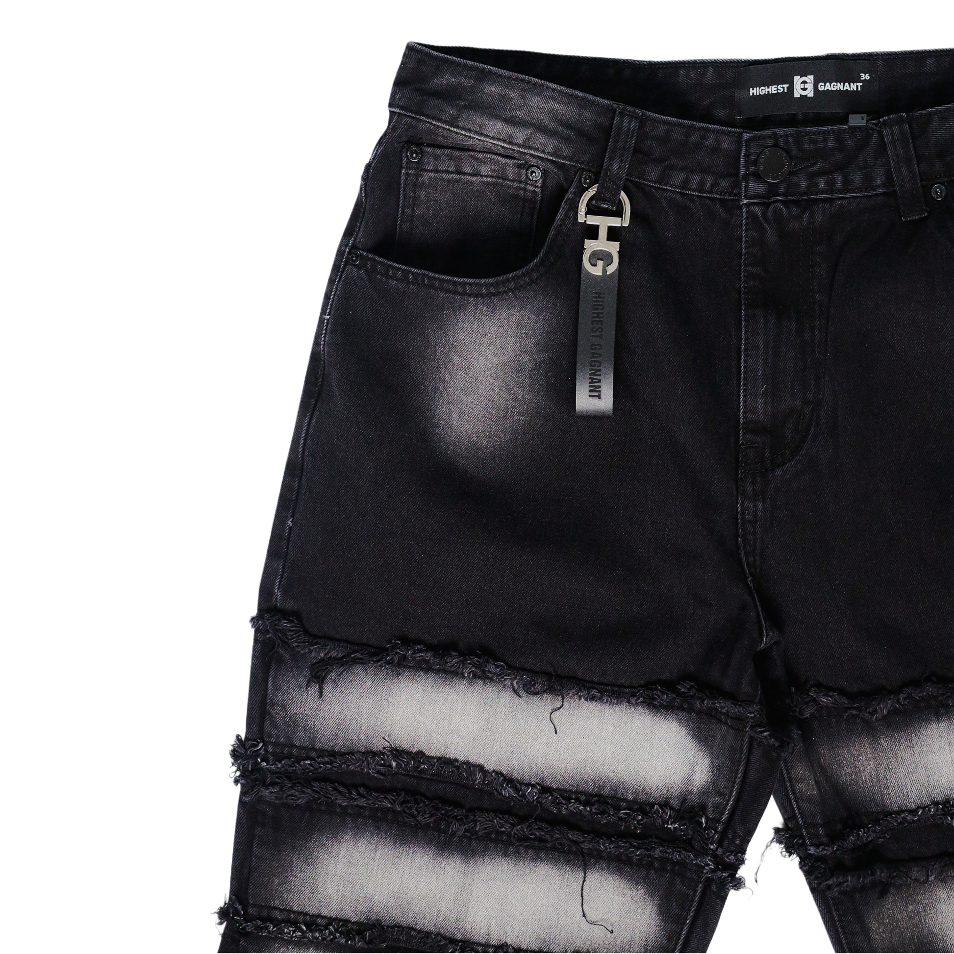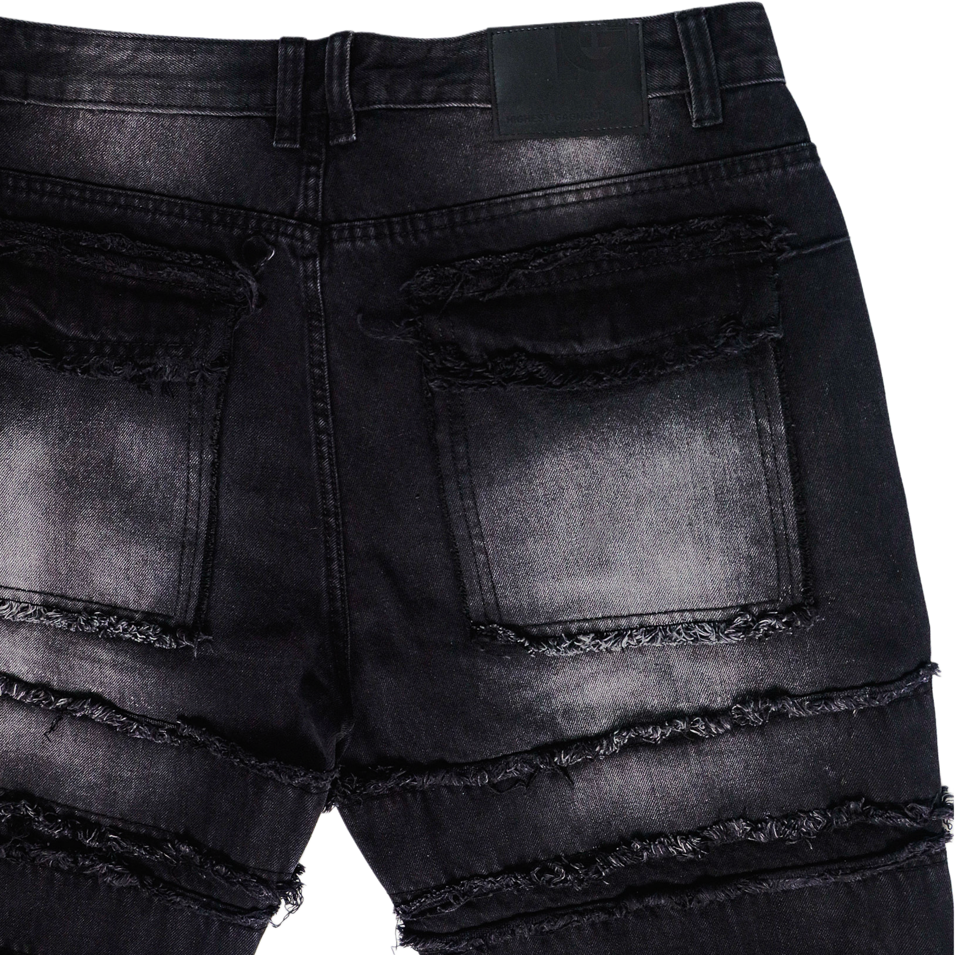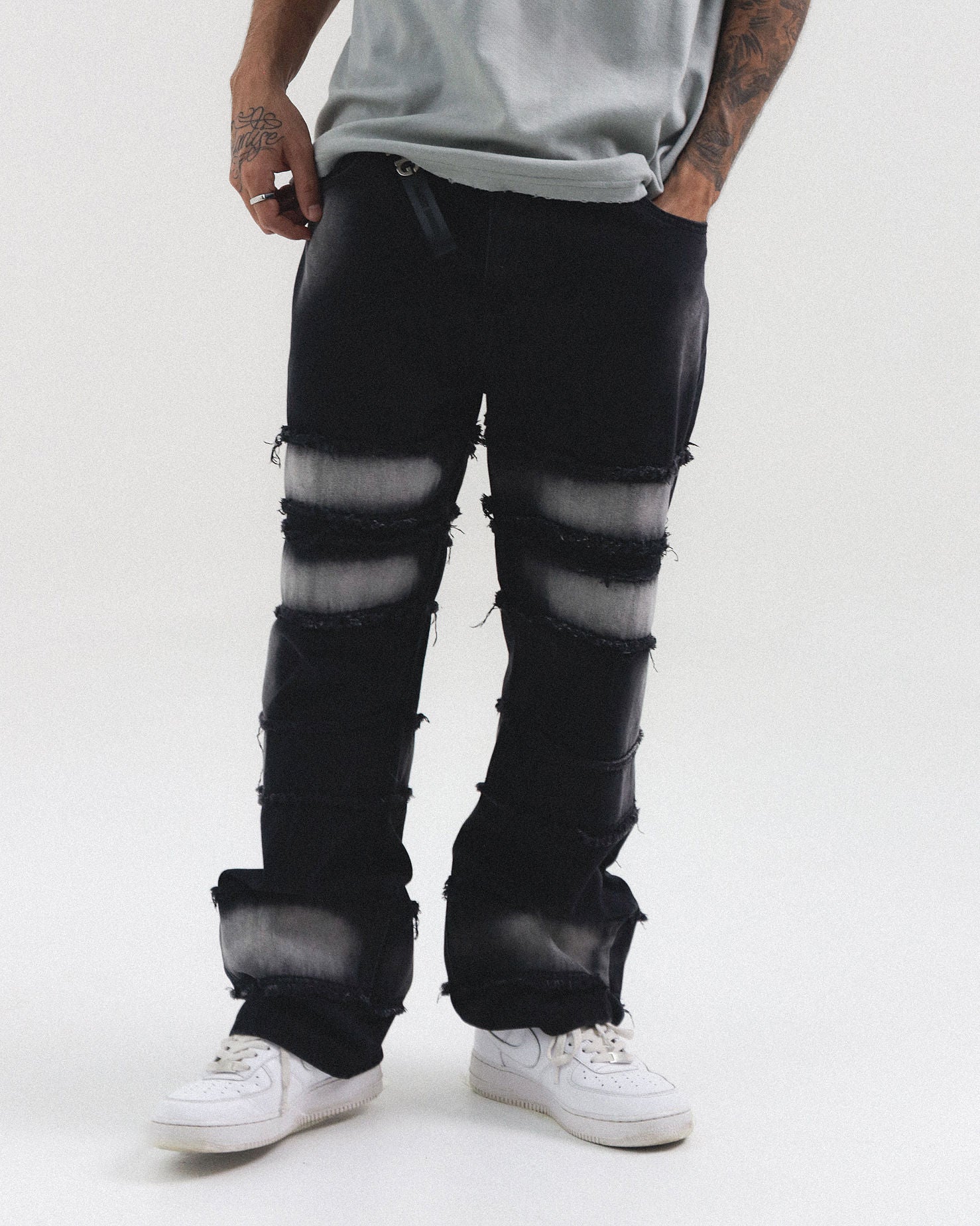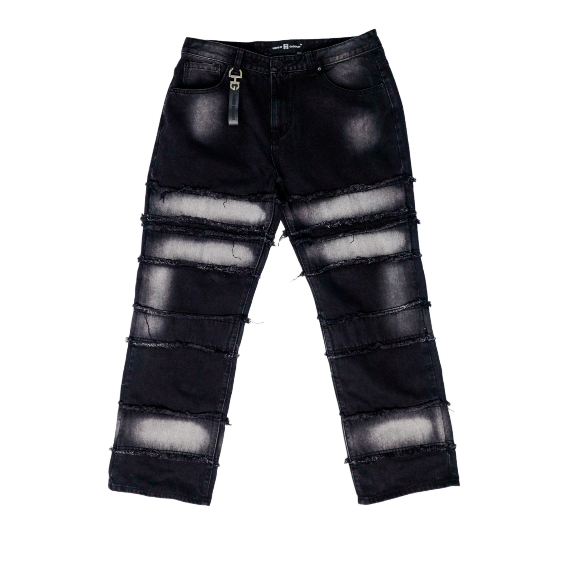 Pantalón de mezclilla negra rigída con costuras desgastadas alrededor de la prenda.