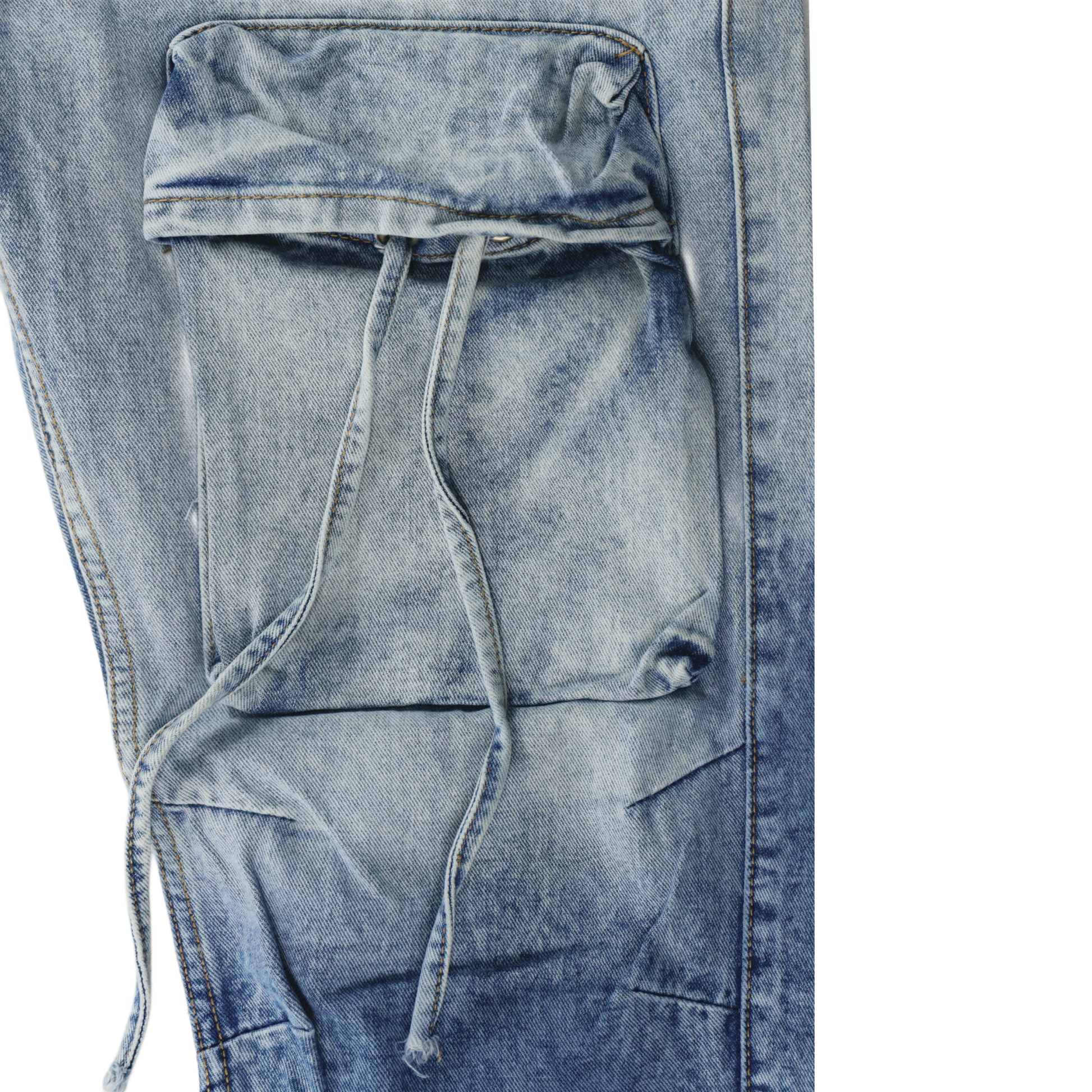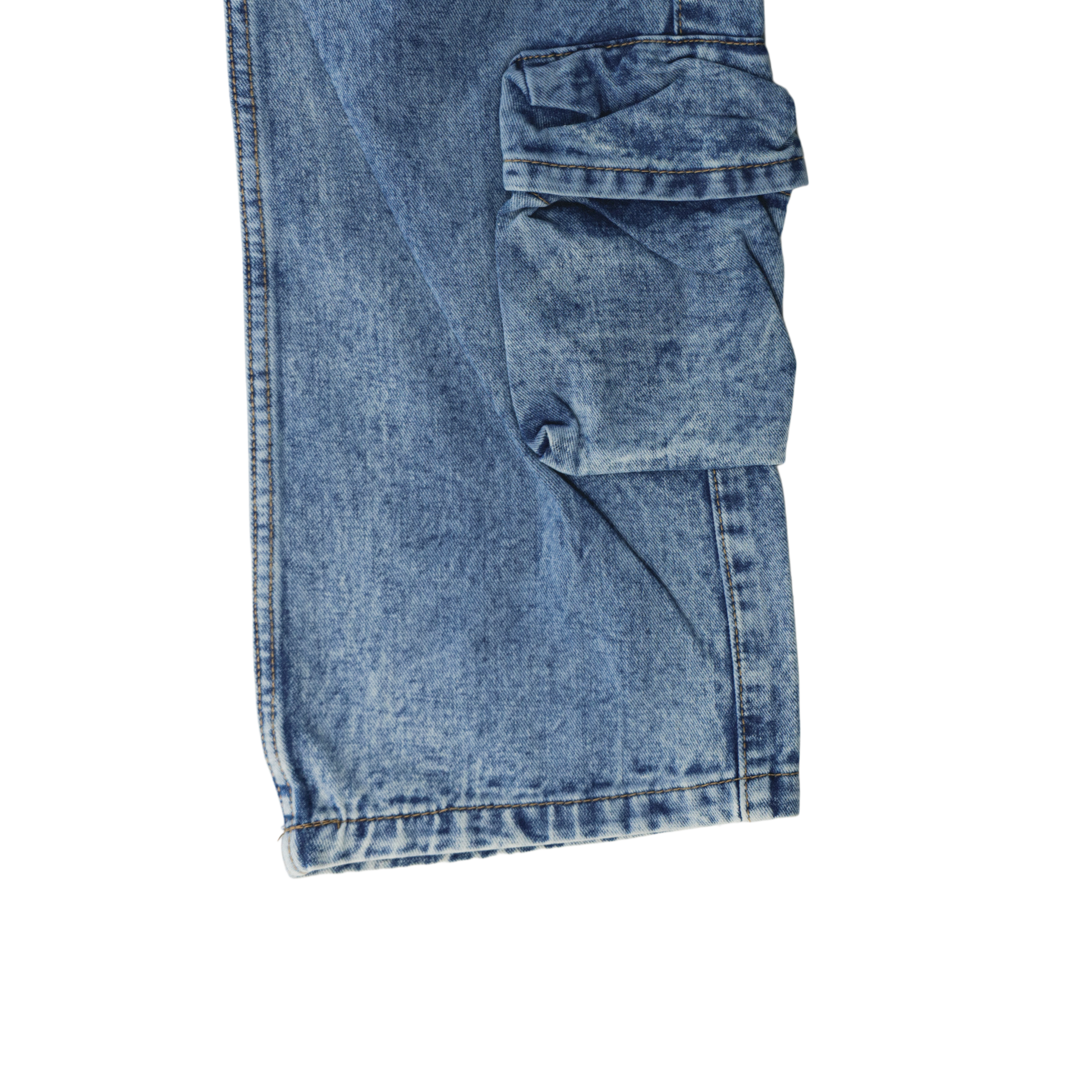 Pantalón de mezclilla procesado en lavandería con desgaste difuminado. Bolsas cargo al frente y a los lados en bajos.