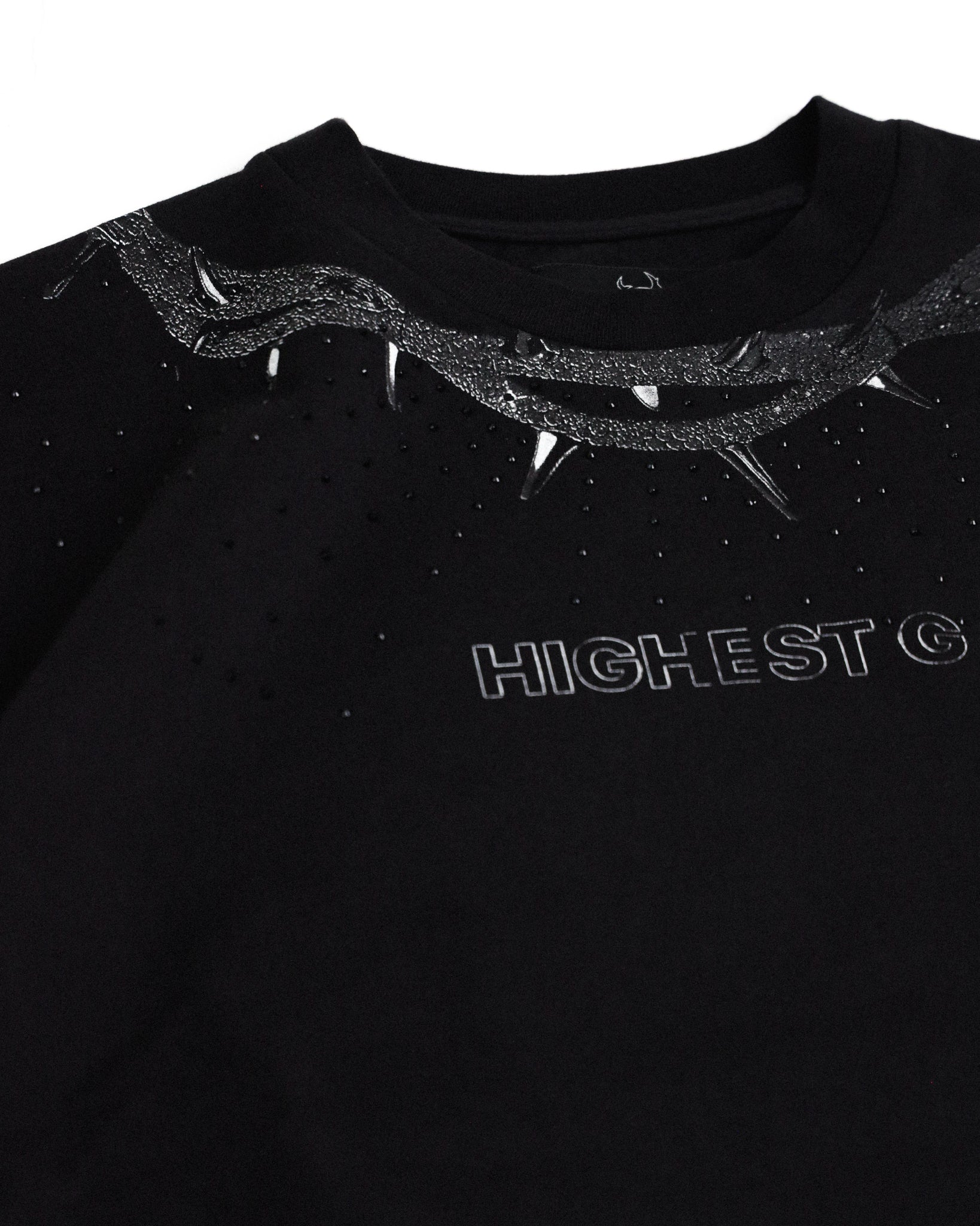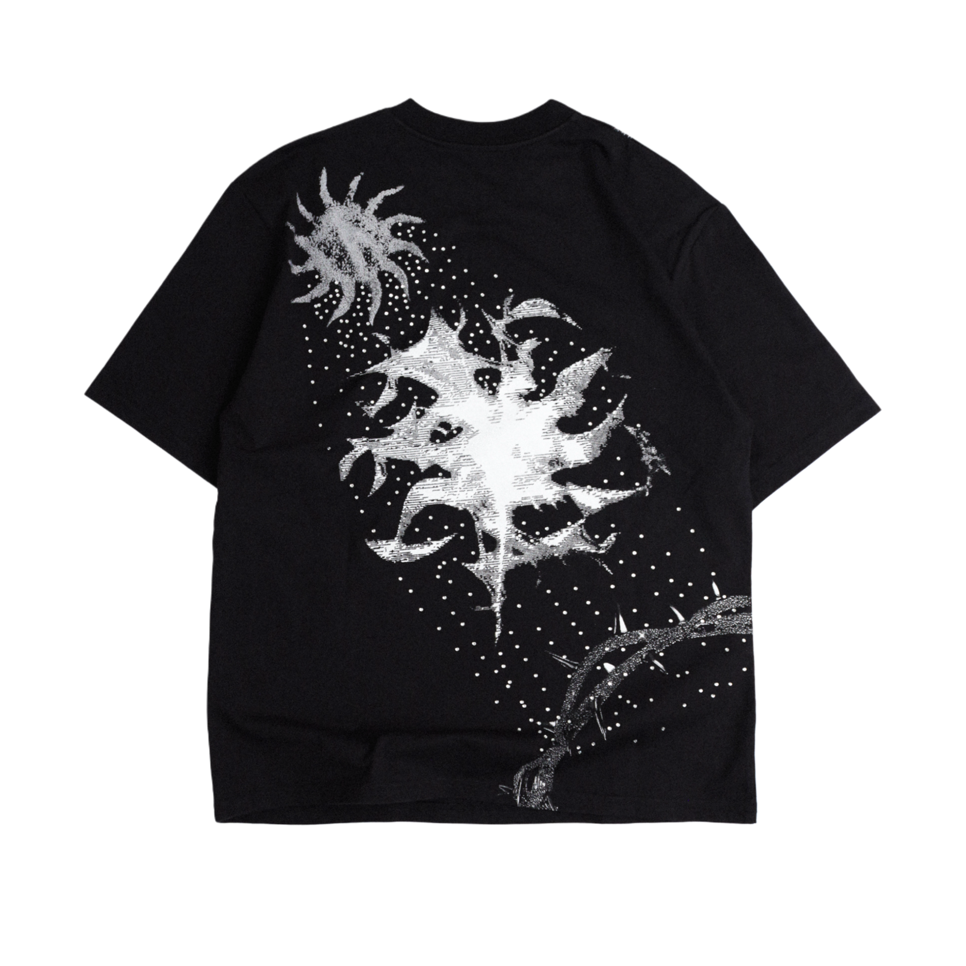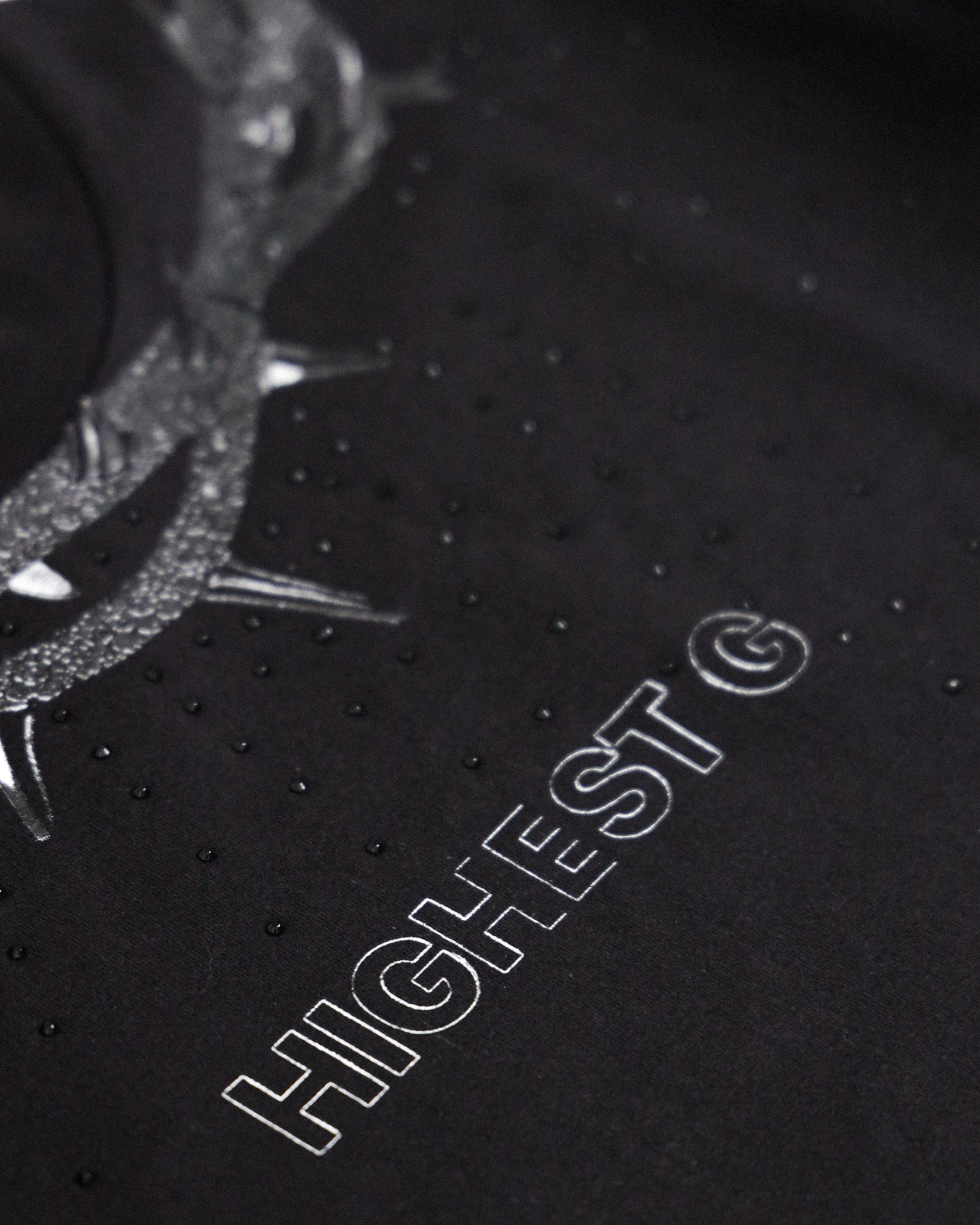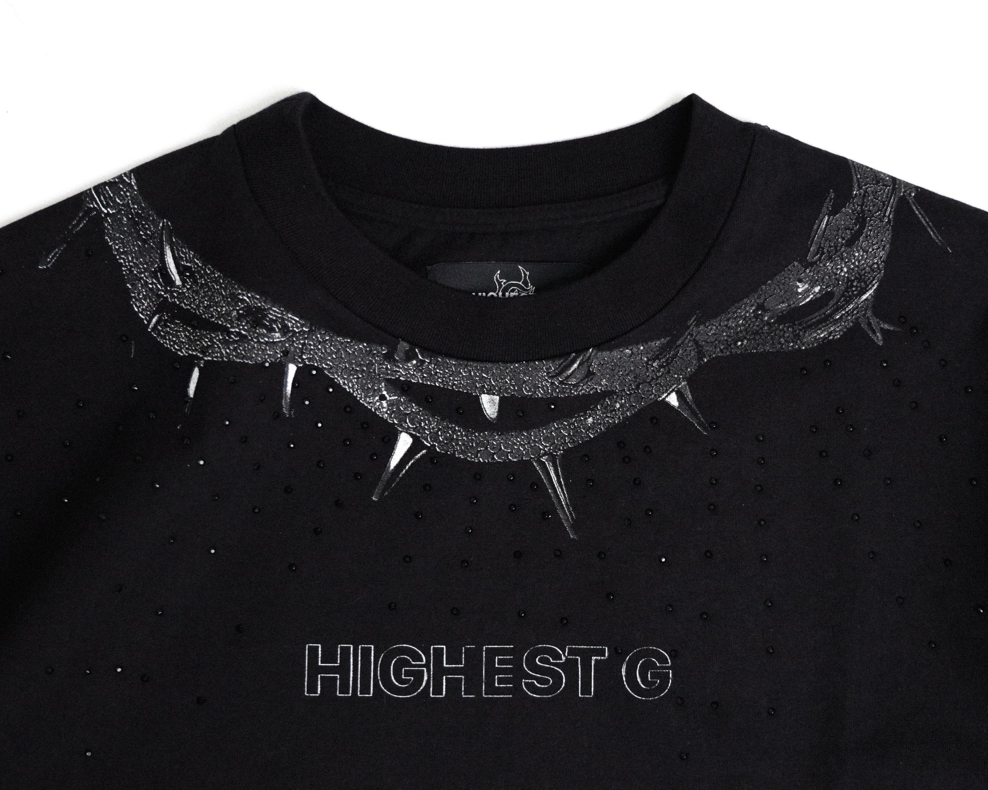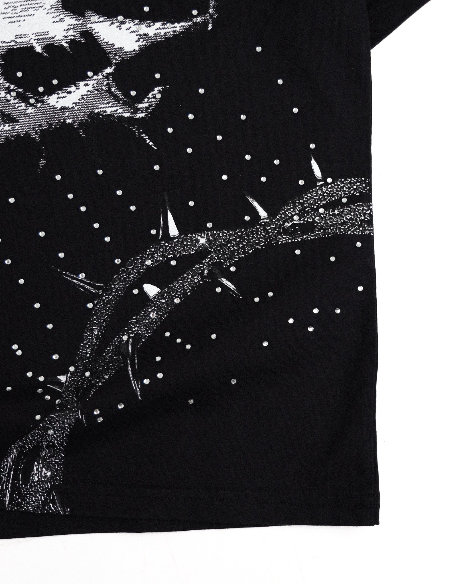 Playera de algodón, diseño en serigrafía con pedrería en frente y espalda.