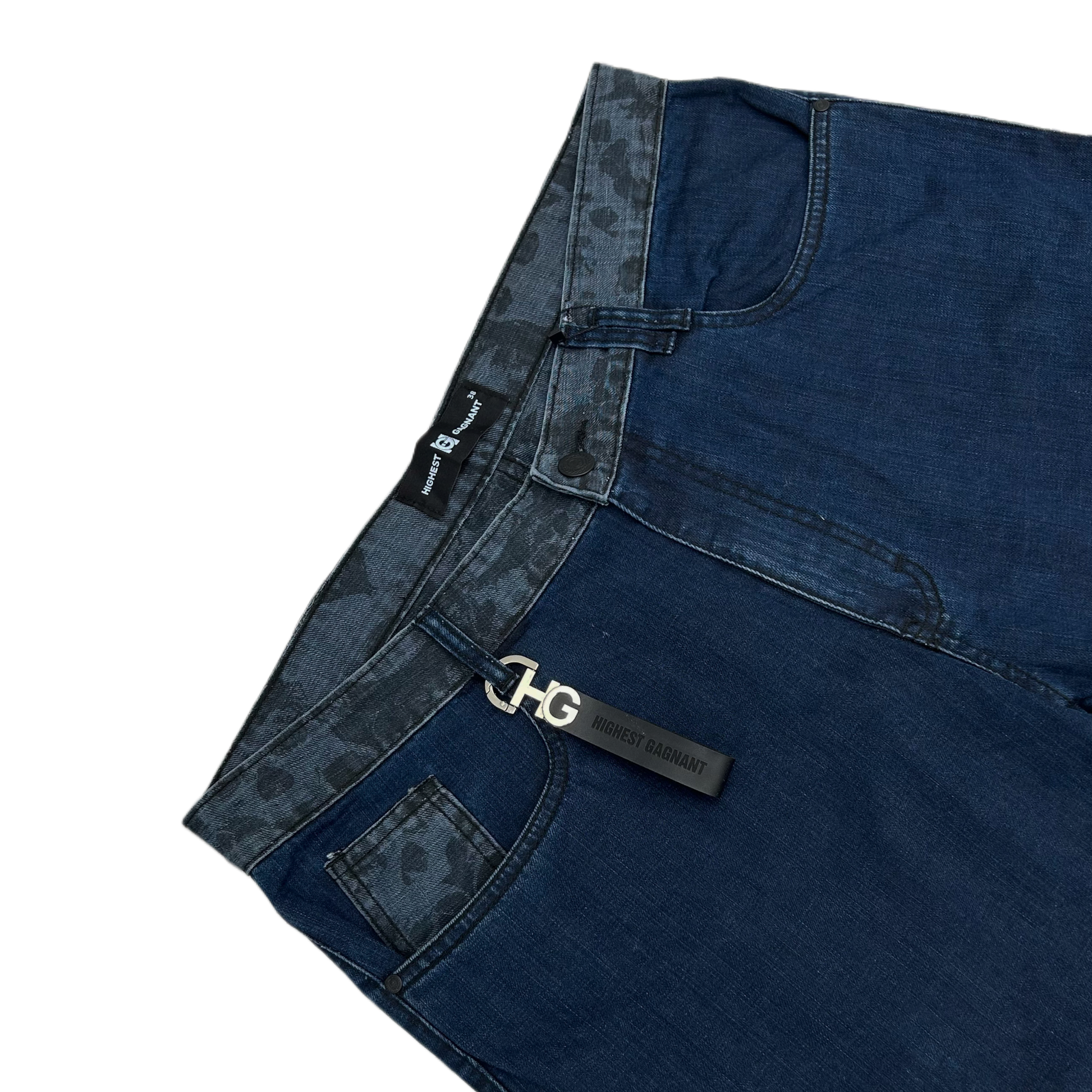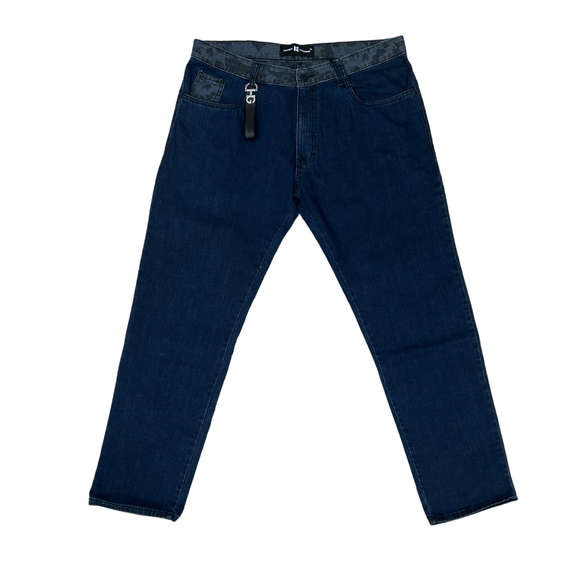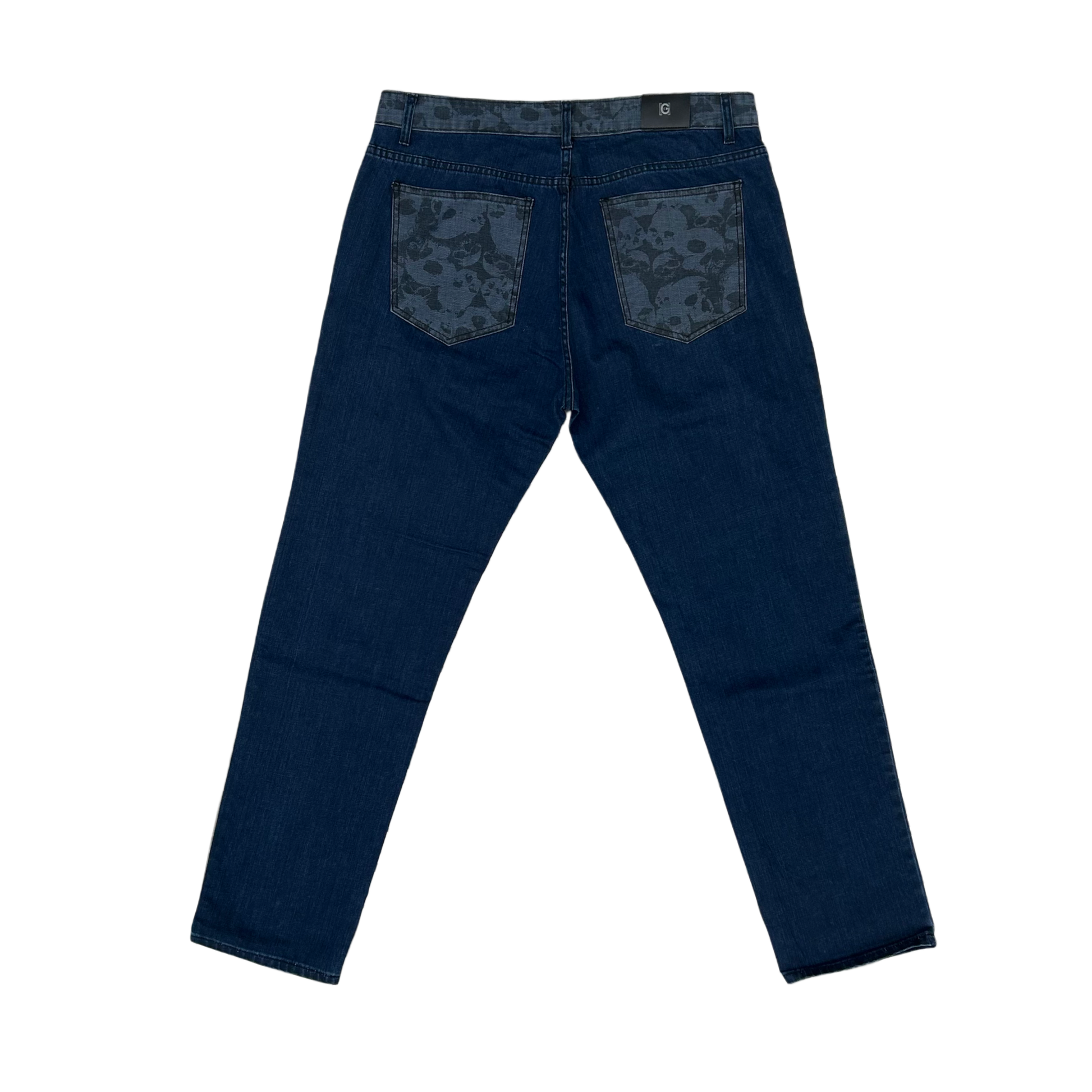 Pantalón recto de mezclilla stretch liso con diseño de cráneos en pretina y bolsas traseras hecho con láser.